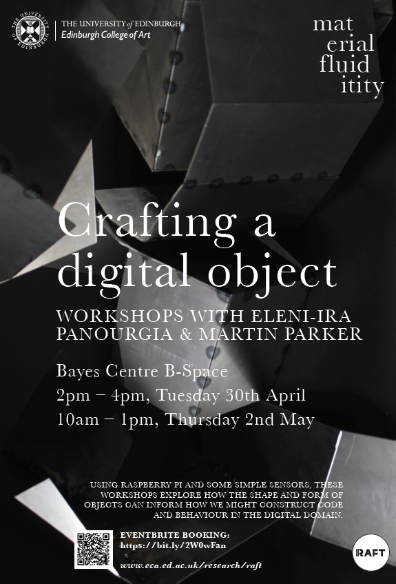 Using Raspberry Pi and some simple sensors, we explore how the shape and form of objects can inform how we might construct code and behaviour in the digital domain. We consider how an object can express itself via digital layers and mechanisms. We use Python scripts to get information from the Raspberry Pi to other computers and software. We sculpt objects that may influence the way we design code. We also explore sound and visual software languages like Pure Data and MaxMSP.
